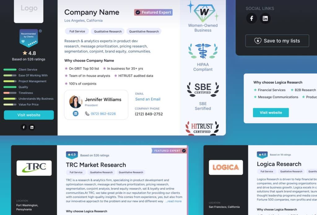 Elevate your search for the perfect research partner! With almost 400 market research specialties at your fingertips, you can now save your favorite companies for effortless future access. Our intuitive search and easy-to-navigate company pages ensure you find the information that matters to you most, helping you make informed decisions with just a click.