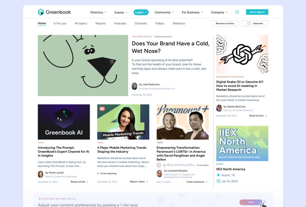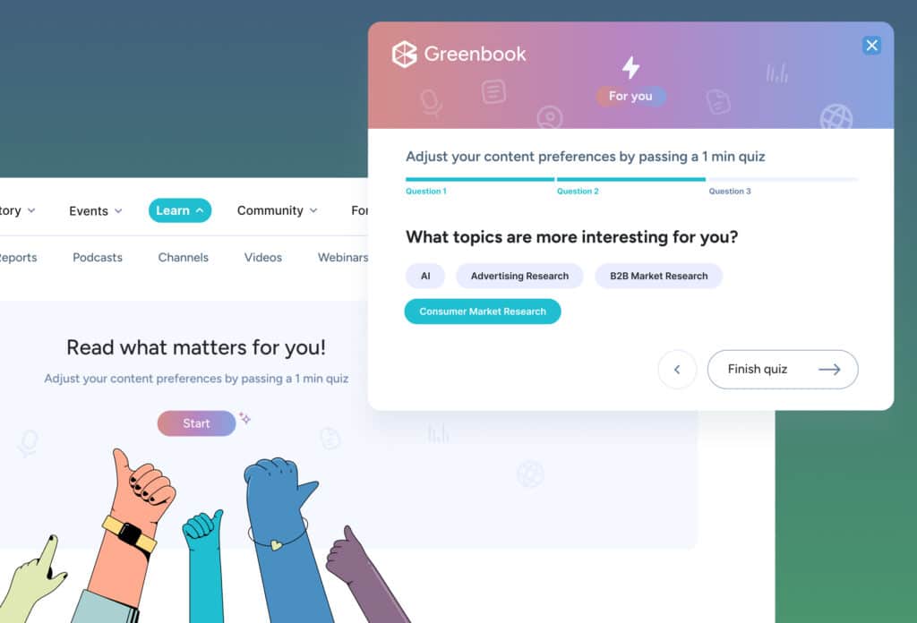 A Greenbook experience tailored just for you is coming soon. Create an account, take a quick quiz, and mark your favorite content to train our algorithm. We will bring forward and highlight the insights that matter most to your business and professional growth.